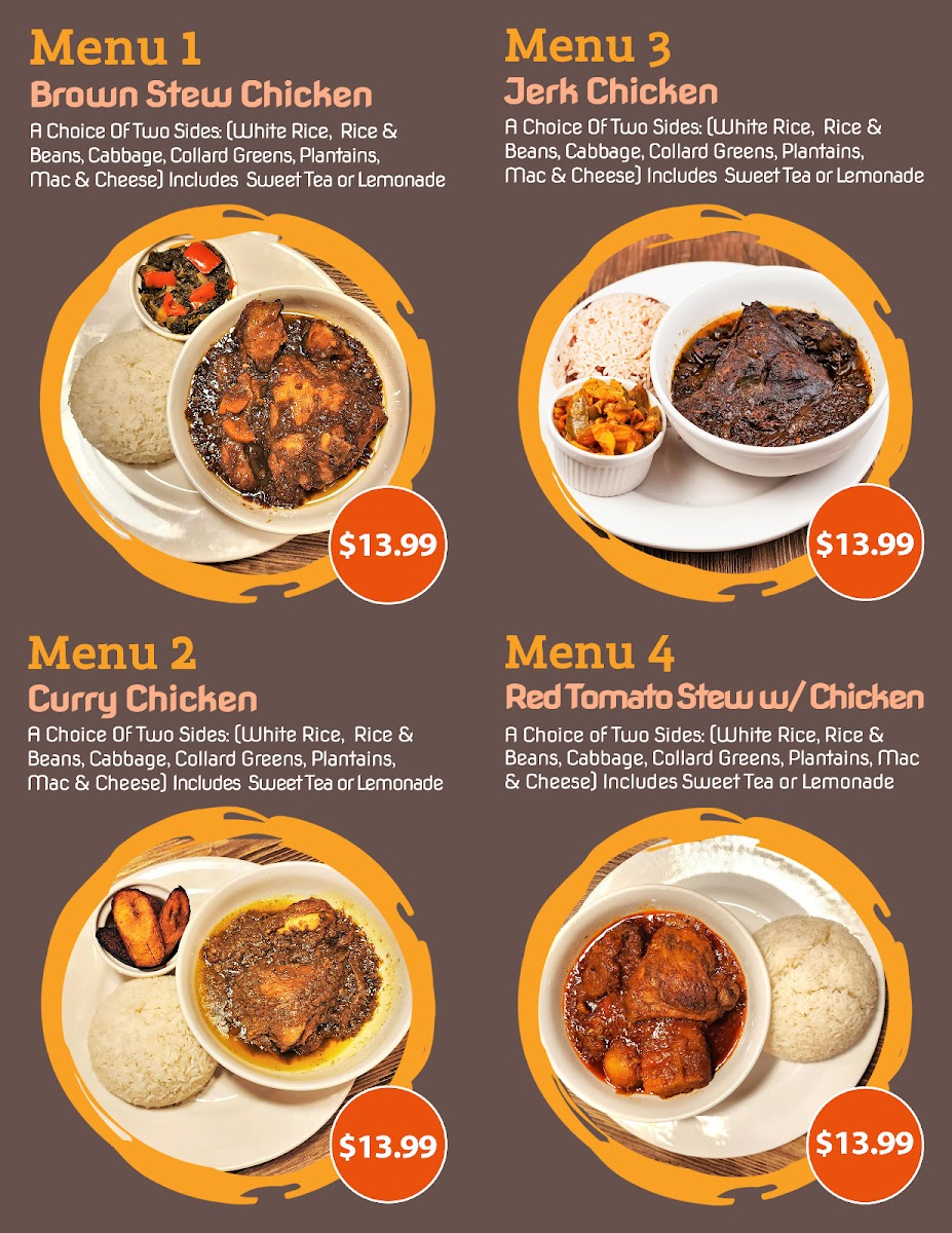 A choice of two sides: (white rice, rice & beans, cabbage, collard greens, plantains, mac & cheese) includes sweet tea or lemonade.
