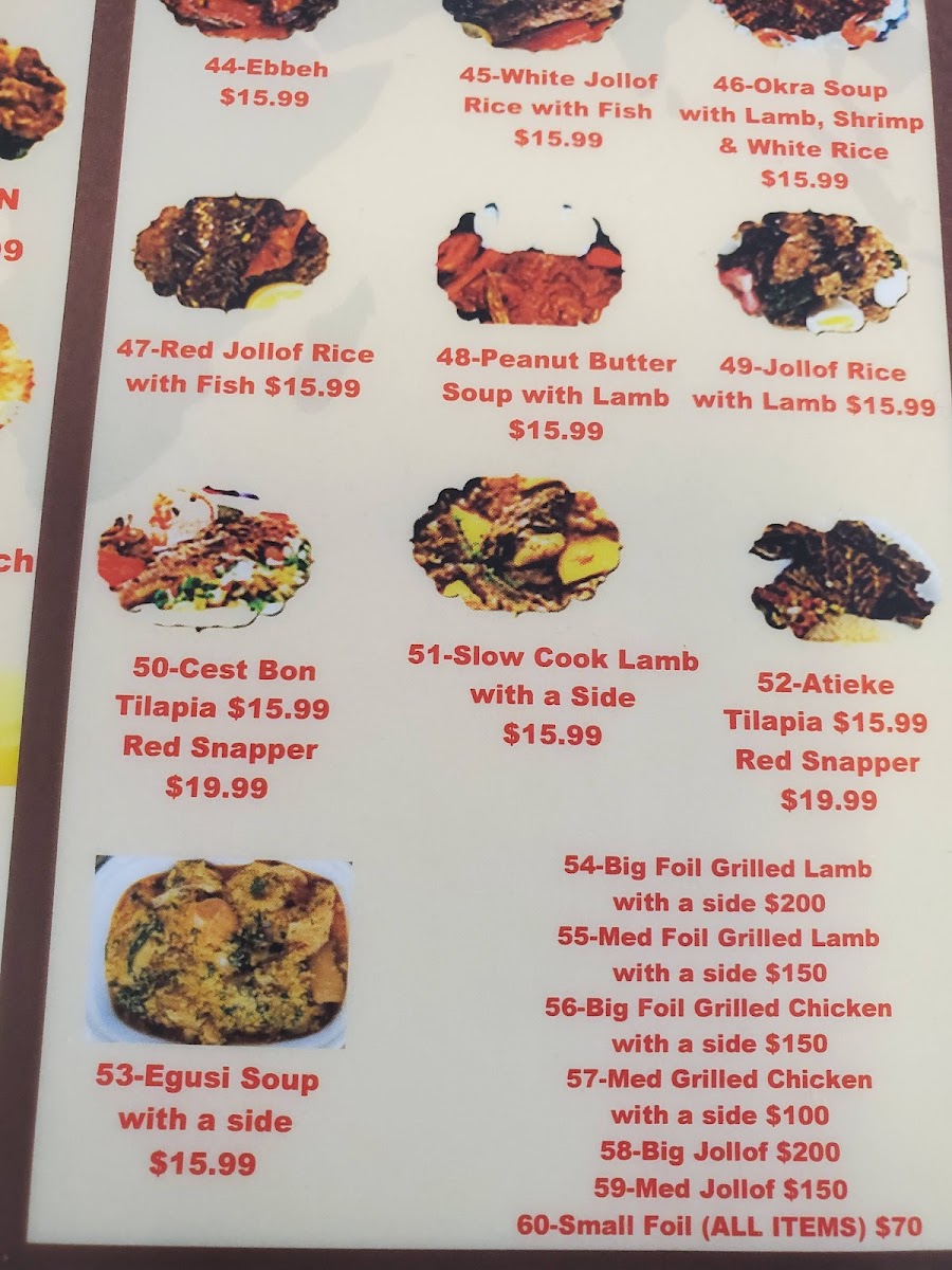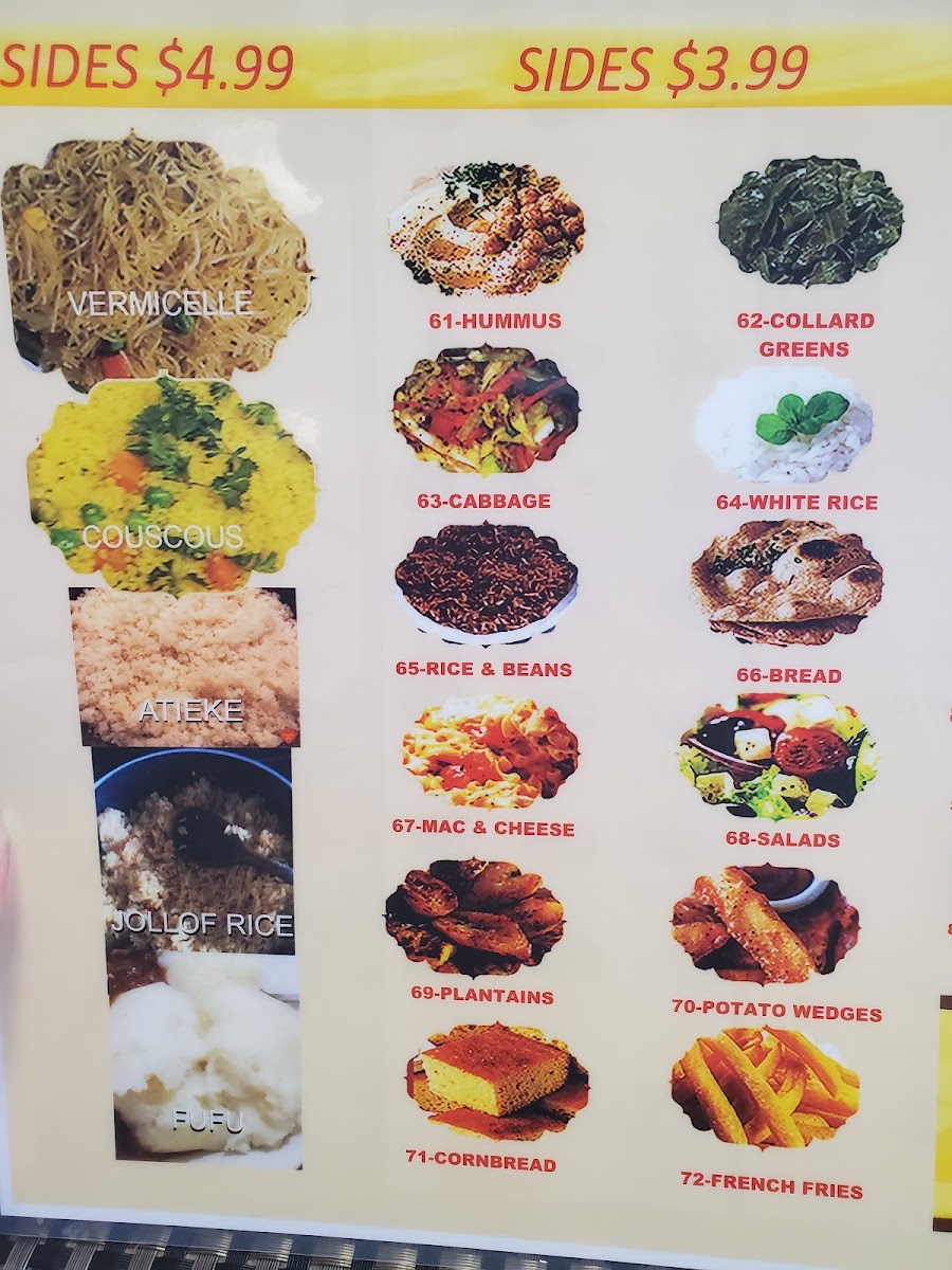 A choice of one side: (salad, plantains, collard greens, cabbage, fries, couscous or vermicelle)