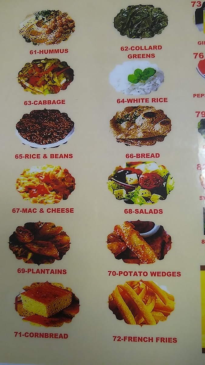 A choice of one side: (salad, plantains, collard greens, cabbage, fries and mac &cheese)